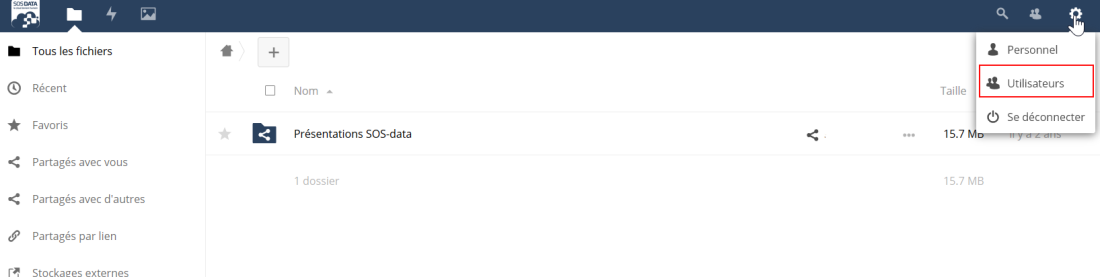 Si vous en avez le droit, vous pouvez gérer les utilisateurs MyCloud. Pour cela cliquez sur la roue crantée en haut à droite puis sur Utilisateurs