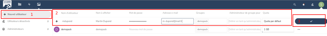 Vous pouvez créer un nouveau compte utilisateur en cliquant sur le bouton Nouvel utilisateur + (1) dans le menu de gauche.