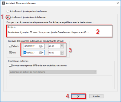 - (1) Cochez la case “Actuellement, je suis absent du bureau” pour activer les messages d’absences.