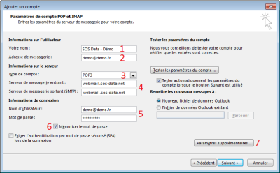 - Pour les champs “serveur de courrier entrant” (4) et “serveur de courrier sortant (SMTP)” (4), indiquez “zimbra.sos-data.net”