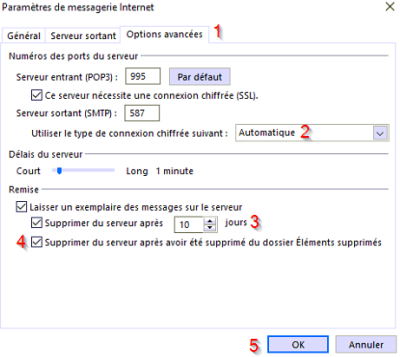 - Cochez la case “Supprimer du serveur après avoir été supprimé du dossier Éléments supprimés” (4).