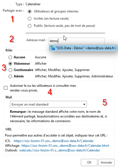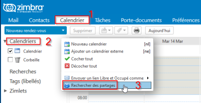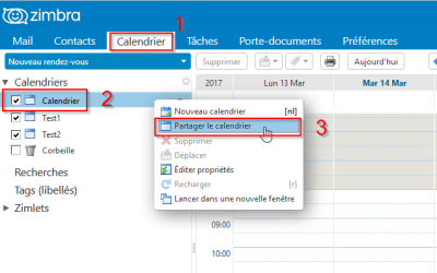 Zimbra permet de partager les calendriers à plusieurs niveaux.