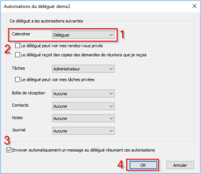 - (2) Vous pouvez autoriser la personne déléguée à voir le contenu de vos rendez-vous marqués comme privés et demander à ce que la personne déléguée reçoive elle aussi les demandes de réunions.